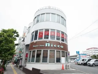 イワキメガネ前の信号を渡り、目の前の角地に円形型のビルが見えます。