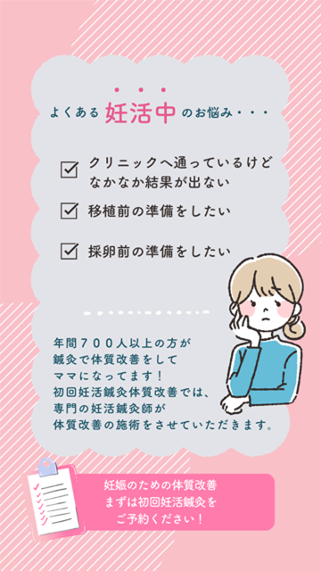 1妊活体質チェック専門の鍼灸師があなたの体調や体質を確認し、改善に向けた方向性を丁寧にお伝えします。