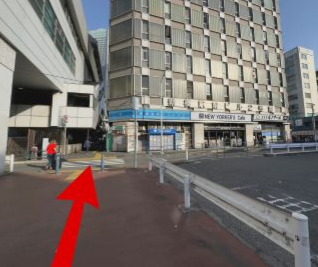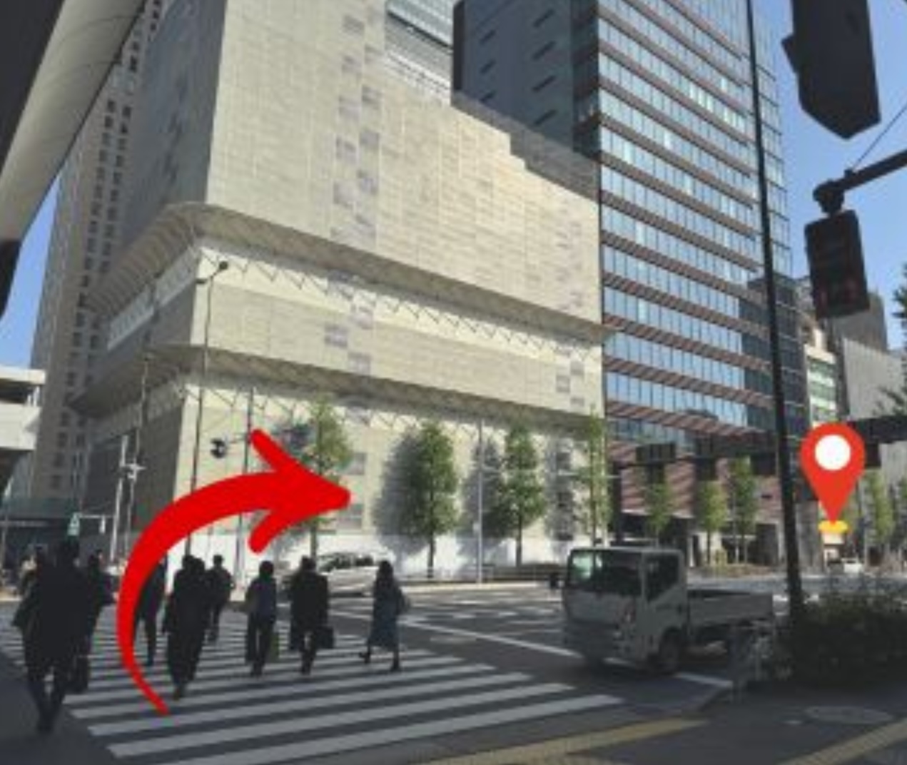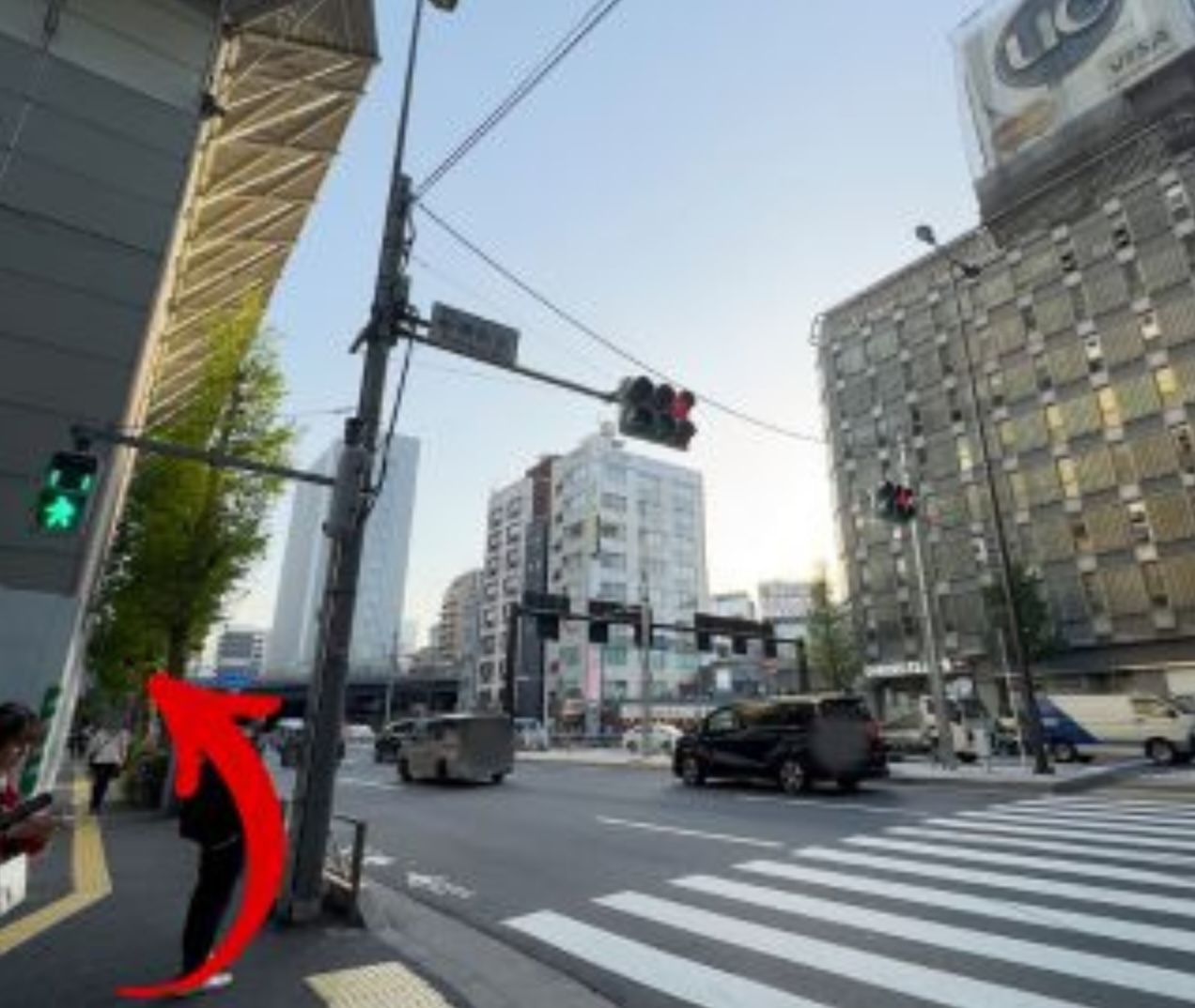 大きな交差点【新橋駅前】の信号を渡りきったら、右手に進みます。