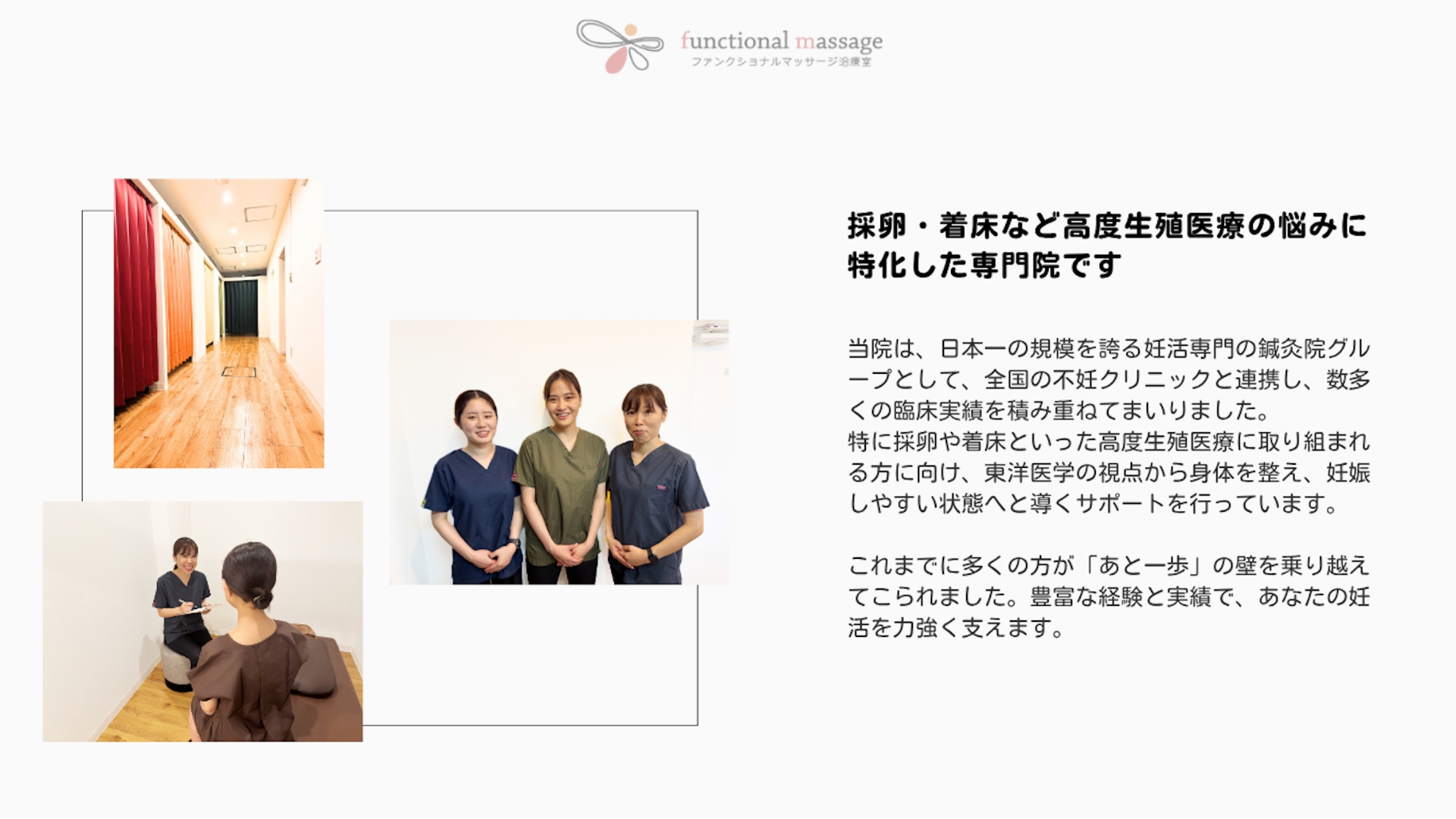 ファンクショナルマッサージの不妊鍼灸についての詳しい内容は、紹介ページがありますのでこちらをご覧ください。