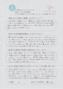 - 自分では意識していなかったような身体の状態を教えていただき、自分の身体を意識するきっかけになりました。栄養面でのアドバイスもしていただき、とても勉強になりました。