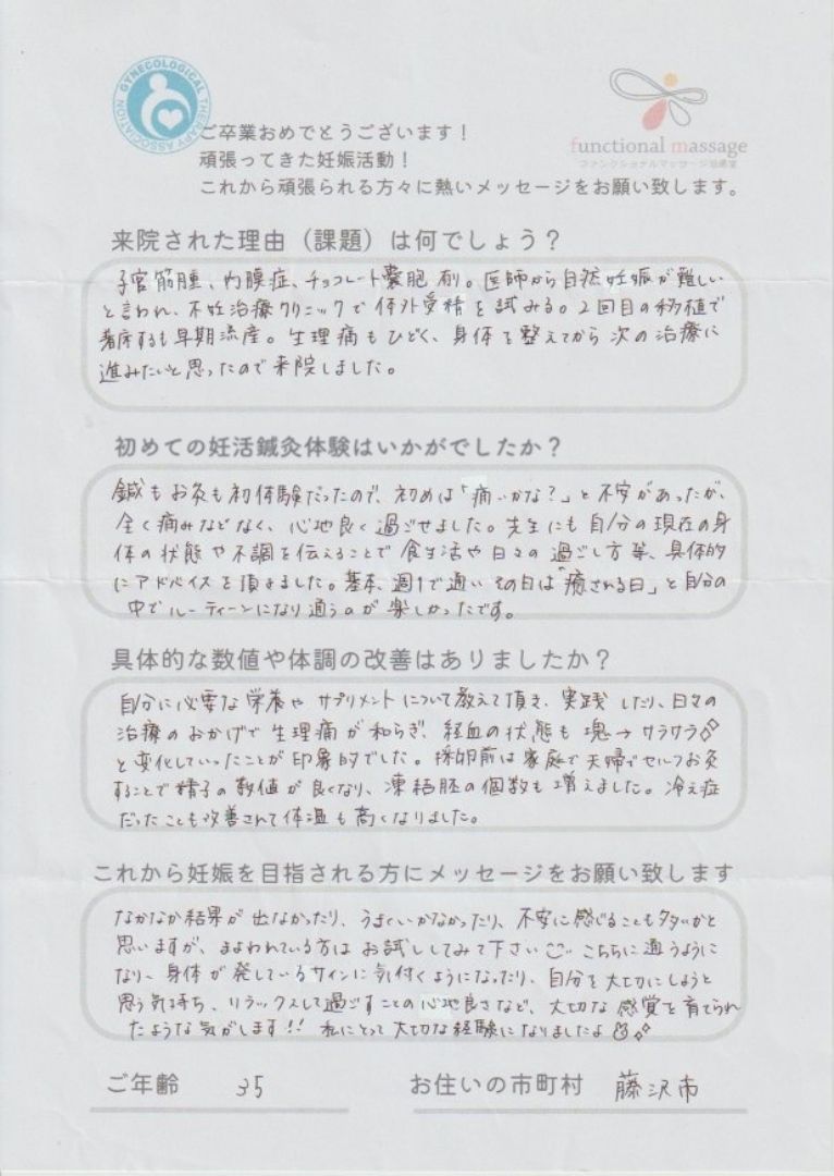 - 長い間不妊に悩んでいた私が妊娠出来たということが全てだと思います。長年の上手くいかなかった経験から自分が妊娠するというイメージが全く持てなくなっていましたが、精神的にも本当に支えになって頂きました。不妊で辛いということを、周囲を心配させたくないという思いから夫や親や友人には話せずにいましたが、こちらの先生方には話すことが出来ました。鍼灸やマッサージ、サプリメント等を続けることで、凝り固まっていた身体が少しずつほぐれて妊娠に至ったと思います。途中から夫もお世話になりましたが、良い時と悪い時の振り幅が大きいという課題が改善し、採卵・採精前に1~2回施術を受けるたけで、数値が良くなりました。