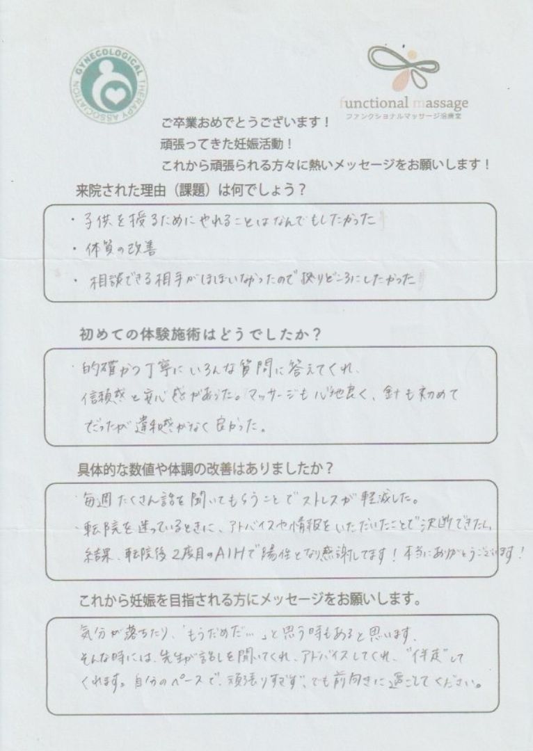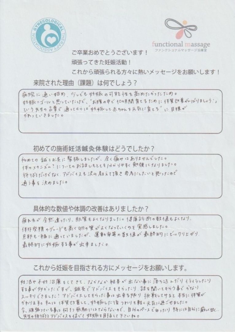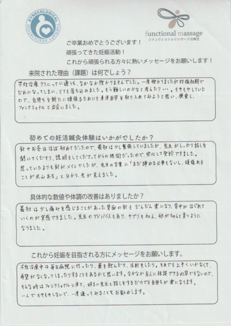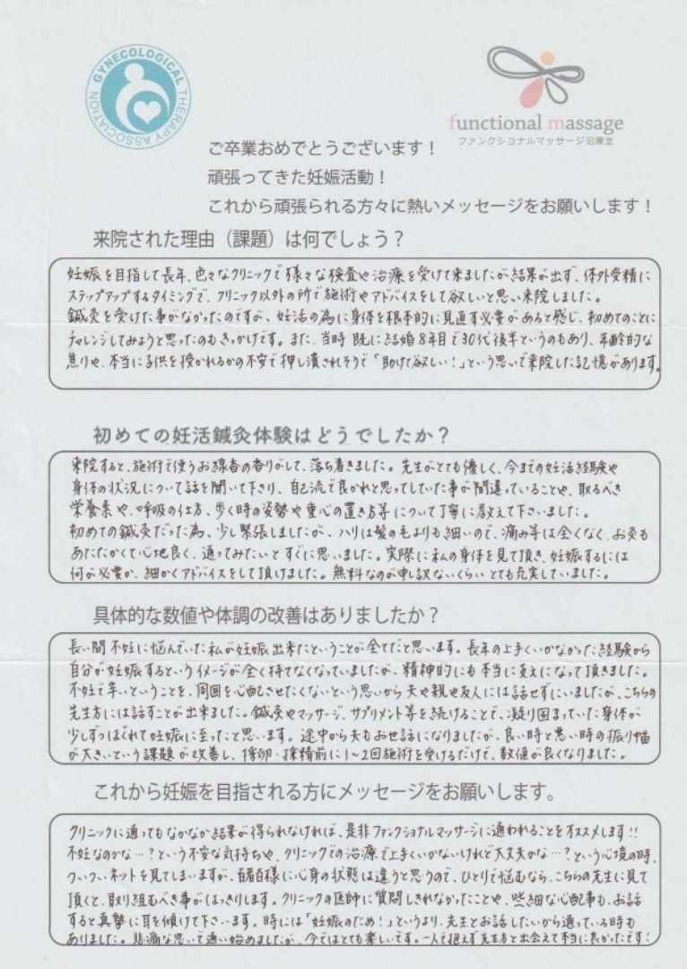 - ファンクショナルマッサージさんでは、病院の診察では相談しづらいようなことも気軽にご相談でき、その安心感が体調に良い影響があったと思います。高齢になって始めた不妊治療(顕微授精)ですが、約半年の施術で良好胚が得られ、妊娠にたどりつくことができました。鍼灸は大変おすすめです。