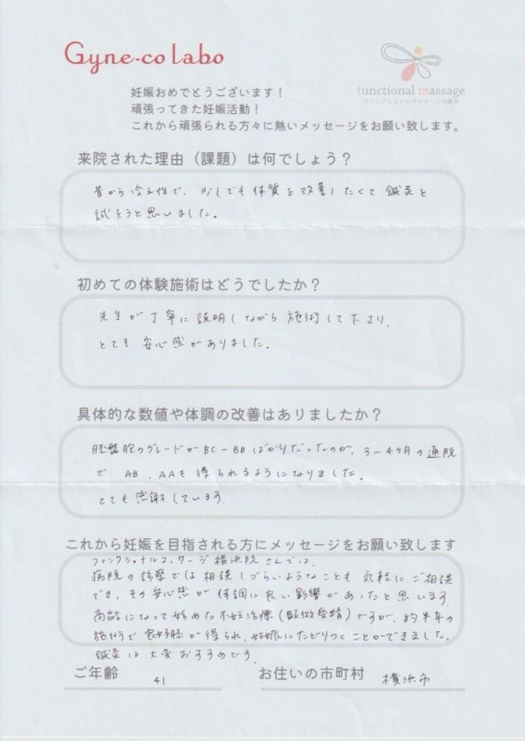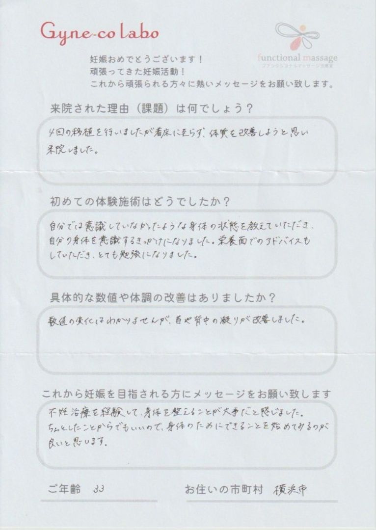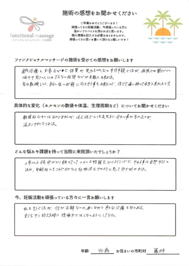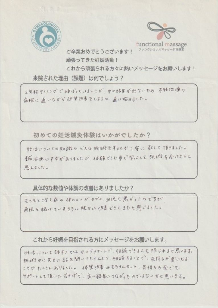 - ファンクショナルマッサージさんでは、病院の診察では相談しづらいようなことも気軽にご相談でき、その安心感が体調に良い影響があったと思います。高齢になって始めた不妊治療(顕微授精)ですが、約半年の施術で良好胚が得られ、妊娠にたどりつくことができました。鍼灸は大変おすすめです。