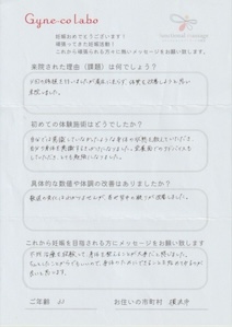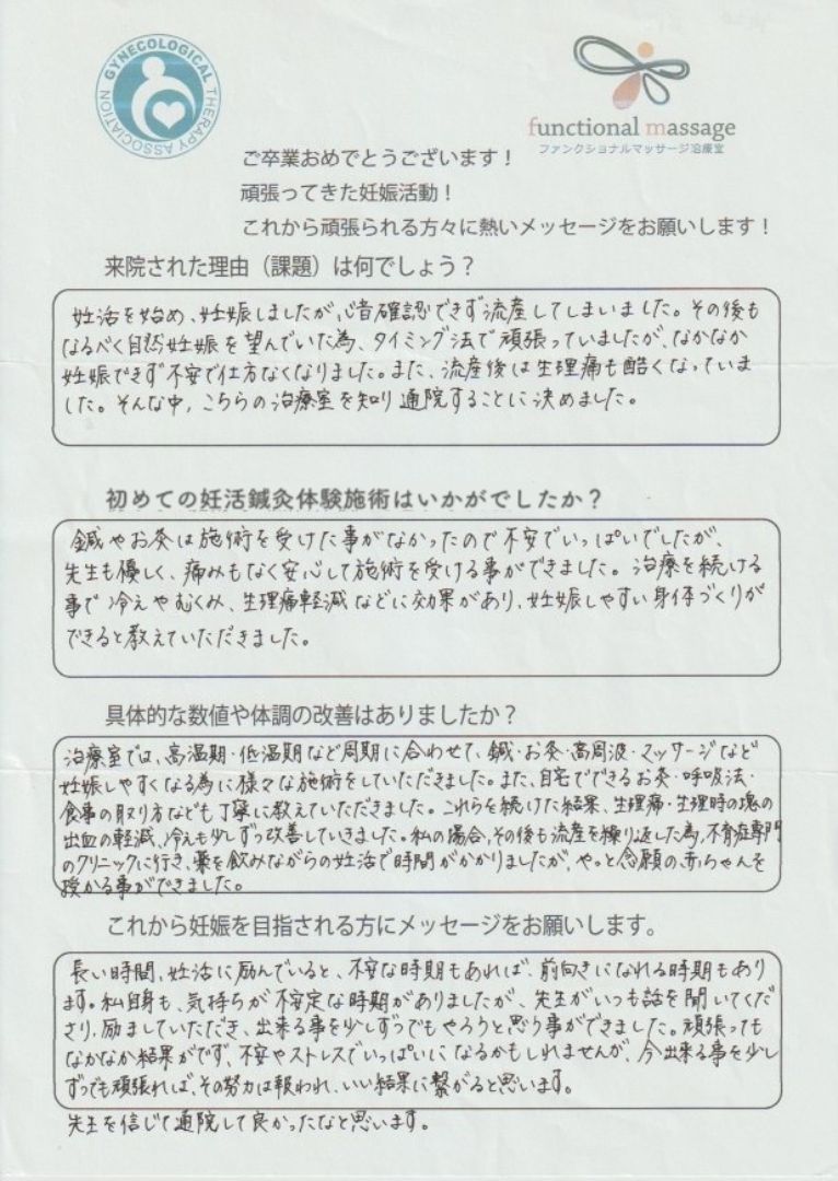 - 本当に施術を受けて良かったです。スタッフの皆様は、丁寧に教えてくださいますし、回を重ねる度に身体が健康になるのが分かり、気持ちも前向きになりました。通い始めて10ヶ日目で初めて妊娠し、11週で流産となり、1年と3ヶ月目で2回目の妊娠をし、その後化学流産となりましたが、温かい言集をかけていただき、卵がしっかり成長出来る様に提案がありまして、1年と7ヶ月目に3回目の妊娠をし、現在臨月です。つわりも比較約軽く、血液検査も正常でしたので、その点も良かったと思いました。