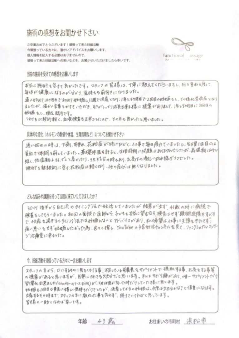 - 30代後半から自己流のタイミング法で妊活していましたが結果が出ず、41歳の時に病院で検査をしてもらいました。初回の面談で医師から、子どもを本当に望むなら、検査はせず顕微授精をすべきで、40歳を過ぎるとタイミング法では妊娠しないとアドバイスがあり、私の希望は仕事に支障をきたさず、痛い思いをせず妊娠したかった為、色々と探し、YouTubeの子宮妊活チャンネルを見て、ファンクショナルマッサージ治療室に来ました。