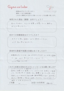 - 最初は少し痛みを感じることがあった背面の針もだんだん楽になり、背中がほぐれていくのが実感できました。先生のアドバイスもあり、サプリも加え、卵がちゃんと育つようになりました。